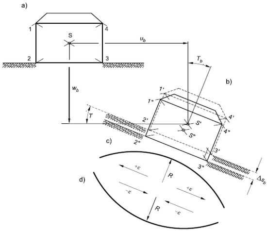 Diagram of the building in any position on the basin: (a) starting position; (b) position after displacement; (c) convex basin rim; (d) concave basin rim [30]. Reproduced with permission from [30]; published by Wydawnictwo ITB, 2021.