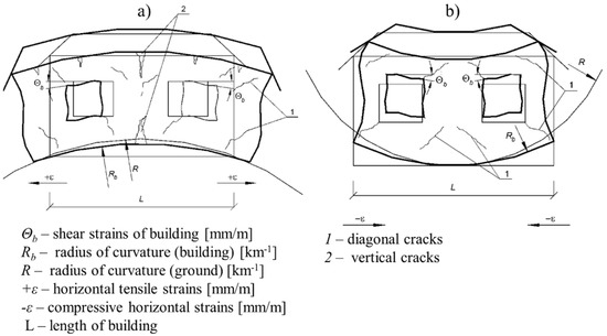 Diagram of damages in buildings located on a: (a) convex edge of the mining basin; (b) concave edge of the mining basin [30]. Reproduced with permission from [30]; published by Wydawnictwo ITB, 2021.