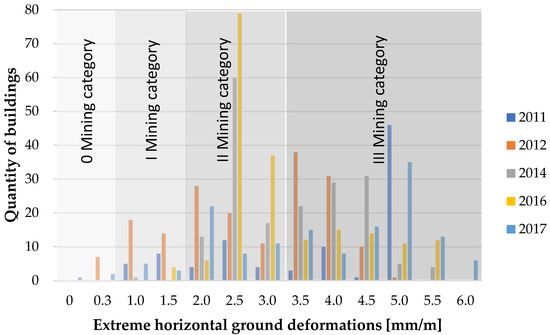 Building a database appropriate for the analysis requires collecting information on mining influences in the locations of individual buildings. For this purpose, information on the forecasted values of horizontal soil deformation (ε-cf. Figure 2) was collected. The values of the mining influences result from mining forecasts regularly verified and approved by the results obtained on the geodesic measuring lines run along streets and at scattered points located on buildings. Figure 5 presents the quantity of buildings affected by the influence of horizontal ground deformations, with an accuracy of 0.5 mm/m. By using the influence of horizontal deformations, the resulting categories of the mining area were determined [30].