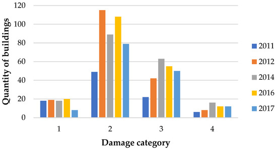 Each building is classified into one of the four damage categories. These categories take into account the extent and intensity of damage and threats to the safety of the facility and its users [31].