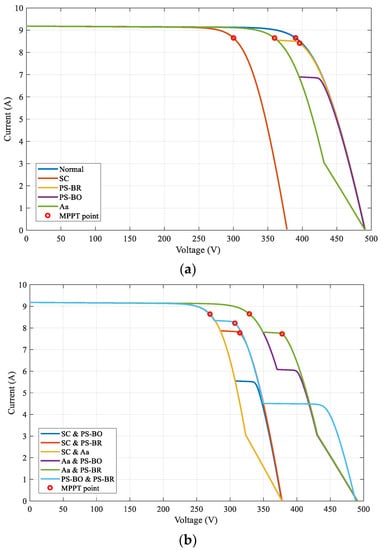 Characteristics of the I-V curve in different states under STC. (a) Single fault states; (b) Multiple-fault states.