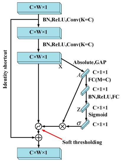DRSN includes a soft threshold and attention mechanism. The input data whose absolute value is less than the threshold value can be set to 0 by the soft threshold and shrink the input data whose absolute value is greater than the threshold value toward zero. At the same time, soft threshold can also reduce the risks of gradient dispersion and gradient explosion that deep learning algorithms can encounter to a certain extent [29]. However, there is an obvious shortcoming when soft threshold is applied alone. That is, it cannot adaptively adjust the size of the threshold according to the different characteristics of the noise of each sample.