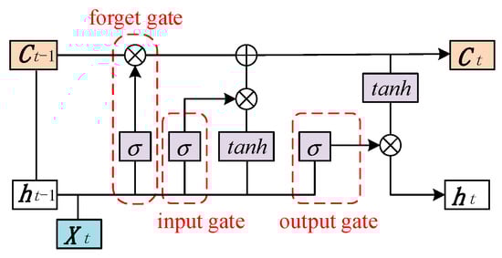 LSTM is one of the variants of the recurrent neural network (RNN) [31]. The architecture of LSTM is shown in Figure 3, and its principle can be expressed as follows: the discarded information is determined through the forgetting gate, the information of the previous hidden state and the information of the current input are transmitted through the input gate, and the value of the next hidden state is determined through the output gate.