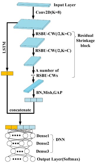 Through the above analysis, an end-to-end fault diagnosis model based on improved DRSN is proposed. The complete structure of the proposed network is shown in Figure 4, which is mainly composed of DRSN, LSTM, and DNN. In the network, Conv2D represents the two-dimensional convolution layer. “/2” means to move the convolutional kernel with a stride of two to reduce the width of the output feature map. First of all, the improved network reduces the impact of noise on the network and extracts the static characteristics of the fault samples by the DRSN branch. Furthermore, it memorizes and mines the dynamic timing law of the fault samples in the time dimension by the LSTM branch. Then, the network connects the fault features of the output of the two branches in series and uses DNN to further mine them. DNN can re-code the combined features to remove some redundant information contained in the features and help the model to accomplish the target task better. Finally, the output of DNN was classified by Softmax funtion.