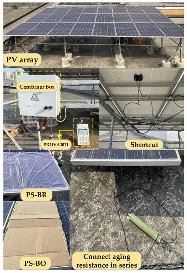 A PV experimental field with a capacity of 6.48 kWp, called field A, was established to evaluate the performance of the proposed method. There are 24 PV modules in it, including two series and 12 PV modules in each series. The parameters of each PV module are illustrated in Table 1. In this study, the fault diagnosis of the single-string PV system is analyzed first. The simulation of the fault is shown in Figure 5. The model of the solar system analyzer is PROVA1011(TES Electrical Electronic Corp, Taiwan, China), which was used to collect the I-V curves of the PV system. Meanwhile, two Y-shaped taps are short-connected to simulate SC faults. Due to its good shading properties and because it is not easily deteriorated when exposed to the sun, corrugated cardboard is chosen to shelter the PV array to simulate PS-BO fault. At this moment, the bypass-diode of the sheltered PV module is turned on. PS-BR faults are simulated by plastic bags with a higher light transmittance, and the bypass-diode of the sheltered PV module reverses. A sliding rheostat is connected in series in the module to simulate the Aa fault of the module. The irradiance range of all experimental samples is about 150 to 1000 W/m2.