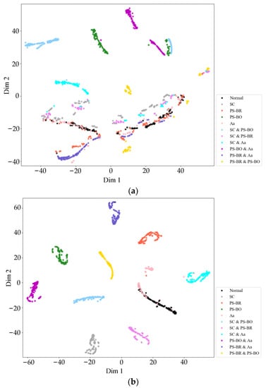 The distribution of the original data is shown in Figure 6a. It can be found that most of the data are relatively discrete, randomly appearing in various regions. Only a small part of the data is relatively centralized. This phenomenon is caused by the fact that t-SNE is essentially a clustering algorithm with classification function. The sample features of normal, SC, PS-BR, and other types of data have not been mined before training, and the differences among samples are small, so it is difficult for the algorithm to cluster them. The I-V curves of PS-BO, SC and PS-BO, and PS-BO and Aa have serious distortion and obvious fault characteristics, so they have significant distribution intervals when they are inputted. However, the samples of these fault types still cannot be gathered in their respective characteristic intervals.