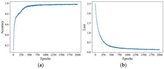 Training results of 2000 iterations. (a) Curve of accuracy–epochs; (b) Curve of loss–epochs.