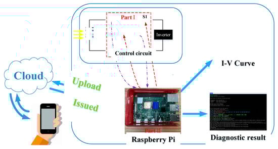 With the development of inverter technology, some commercial inverters can realize I-V curve scanning online, so the proposed algorithm can be embedded into the CPU of the inverter to realize fault diagnosis. In order to ensure that the diagnostic method can be applied to ordinary inverters, this study investigates a PV fault edge diagnosis system based on Raspberry Pi. The structure is shown in Figure 11. The device consists of two parts, Part I in Figure 11 is the control circuit. S1 is the control switch used to cut off the connection between the PV and inverter so as to complete the I-V curve scanning. MOSFET chooses the NVHL020N120SC1 module with a maximum drain-to-source voltage of 1200 V and a maximum saturation drain-source current of 103 A. Under the control of Raspberry Pi, the gradual change process from turn-off to turn-on is completed within 2 s; that is, the I-V curve scanning. Voltage and current are collected by selecting hall sensors. Part II in Figure 11 is the control core of the device, the control module is Raspberry Pi, and the AD sampling module is AD7606. When the fault diagnosis is needed, the command is first issued to control the MOSFET operation, and the voltage and current signals are collected by AD7606. Then, the fault diagnosis program is called to complete the PV status recognition. Finally, the diagnosis results are uploaded to the cloud. Operation and maintenance personnel can start fault diagnosis and view diagnosis results in real time through the mobile APP.