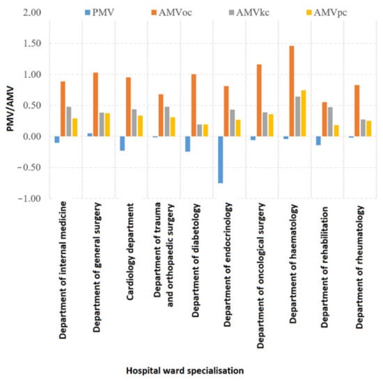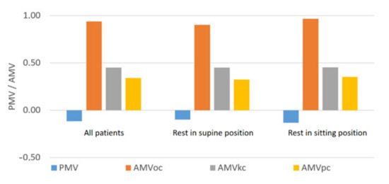 The predicted mean value of thermal conditions according to PMV vs. actual mean value of thermal conditions according to patients’ thermal sensations (AMVoc), thermal comfort feelings (AMVkc), and thermal preferences (AMVpc).