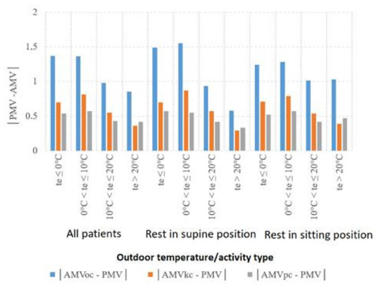 Regardless of the activity of the patients, the discrepancy between the actual and predicted mean rating of the thermal environment is similar, which may provide further justification that computational methodologies [7,27,28] with similar predictive performance were applied to both groups of patients.