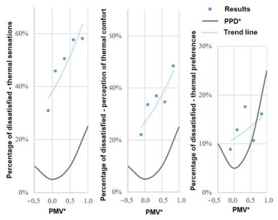 Therefore, the analysis of the adaptive model’s reliability for patients is justified because the phenomena of adaptation to thermal conditions have been confirmed. However, the adaptation model does not provide for the determination of thermal comfort indices as in the case of the PMV model but is based on a graph of the dependence of the permissible values for the individual categories of thermal comfort and operative temperatures on the external temperature. To carry out further analyses in a form similar to the PMV model, it is necessary to make some determinations. The adaptive model is based on the PMV model and, according to Ref. [9], in addition to the thermal comfort condition, it has been assigned the same categories as the PMV model. Since in Ref. [9], concerning the adaptive model, nowhere is it indicated that the categories of thermal comfort should correspond to different values of PMV (predicted mean rating) than for the model specified in [7], for individual categories of thermal comfort, the exact values of the indices mentioned above were assumed as for the PMV model, designating them as PMV* and PPD*. As in the case of the PMV model analysis and in the case of the adaptive model, for all patients, the dependence of the actual and predicted percentage of dissatisfaction on the PMV* index determined by the adaptive model was verified; this was done based on three methods of surveying the conditions of the thermal environment, using questions about thermal sensations, perceived thermal comfort, and thermal preferences (Figure 6).