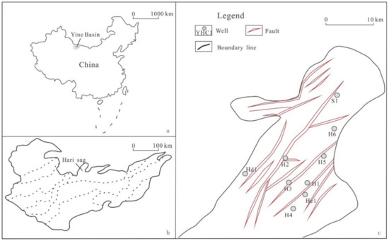 Tectonic location of Yin’e basin (a), tectonic location of the Hari sag (b), and well distribution (c) in the Hari sag.
