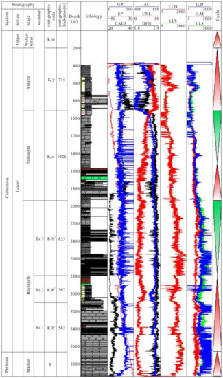 The sedimentary strata include the Carboniferous, the Permian, the Cretaceous, and the Quaternary from bottom to top (Figure 2). The focus of this study is the Cretaceous sequence, which can be divided into the Lower Cretaceous and the Upper Cretaceous. From bottom to top, the lower Cretaceous can be divided into the Bayingebi Formation (K1b), the Suhongtu Formation (K1s), and the Yingen Formation (K1y). The Upper Cretaceous only has the Wulansuhai Formation (K2w). The Bayingebi Formation includes the 1st member (K1b1), the 2nd member (K1b2), and the 3rd member (K1b3) from bottom to top. The Suhongtu Formation is divided into the 1st member (K1s1) and the 2nd member (K1s2) from bottom to top [31].