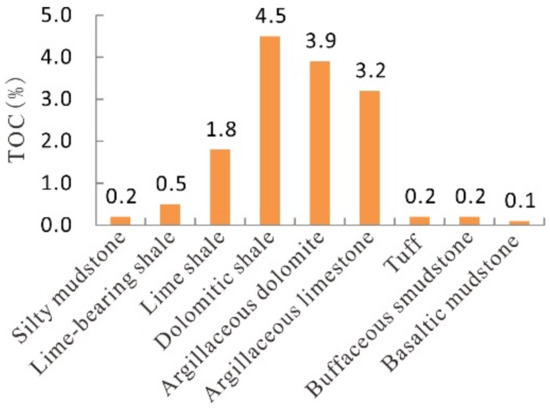 The source rock strata (Yingen Formation and Bayingebi Formation) in the Hari sag are mainly semi-deep and deep lacustrine facies. Source rocks are mainly shale and carbonate rocks. Among these, carbonate-shale had the highest organic matter abundance (Figure 3).