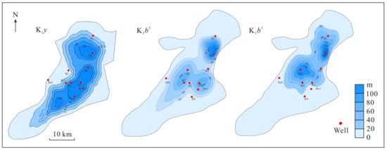 K1b1: The distribution area of the effective source rocks is smaller than that of the two formations above and is closer to the north. The thickness is up to 151 m (Figure 4).