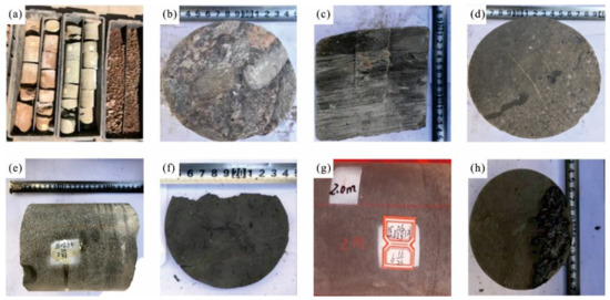 Core images of various reservoir types in the Hari sag. (a) Well Ha 2, mudstone, siltstone, K1s; (b) Well Ha 4, conglomerate, 2726 m, K1b; (c) Well Ha 2, dark fine sandstone, 1307 m, K1b; (d) Well Ha 4, conglomeratic sand, 1862 m, K1s; (e) Well Ha 2, dolomitic shale, 1599 m, K1s; (f) Well Ha 3, black shale, 671 m, K1y; (g) Well Hacan 2, 1722 m, K1s, basalt; (h) Well Hacan 3, mudstone with coal, 711 m, K1s.
