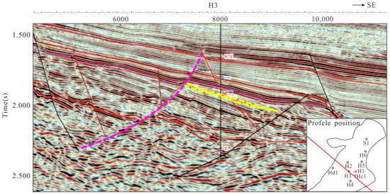 The sandstone fault-lithologic traps in K1b1 are mainly at Well H3, as shown in Figure 7. According to the results of drilling and previous reservoir predictions, the Hari sag belongs to an extremely weak hydrostatic deposition with very limited sandstone. According to data from Well H3, in the early stages of K1b1, the rapid accumulation of alluvial fan deposits was the main mechanism of deposition in the Hari sag, and these deposits did not easily accumulate hydrocarbon due to their poor physical properties. However, at the end of K1b1, a small fine-grained sand body of fan delta deposits was formed in the downward direction of faults or slope break belts. This kind of sand body could easily develop fault-lithologic traps. The quality of physical properties and the matching relationship with source rocks controlled hydrocarbon accumulation in these fault-lithologic traps.