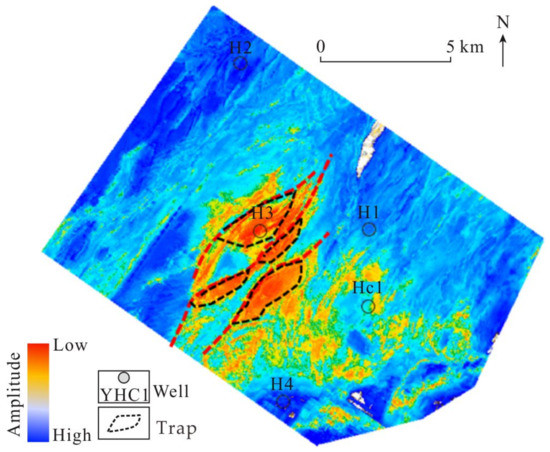 It can be seen from the three-dimensional seismic plane figure of K1b1 in the Hari sag that the sandstone area is relatively small and concentrated and is mainly distributed in Well H3 in its southern part (Figure 8). It is located in the relatively large dip direction of the slope break belt. A total of four small sandstone fault-lithologic traps were found in the 3D seismic area of the Hari sag, and their area is 3.8 km2 (Figure 8).