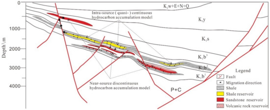 With the progress of hydrocarbon exploration and development, a single conventional or unconventional model has been unable to explain the mechanism of oil and gas charging and accumulation in the same basin or sag [32,33,34,35,36]. In practice, multiple modes are often developed [37,38,39,40]. For example, there are various types of hydrocarbon reservoirs in the Hari sag, including carbonate-shale reservoirs, conventional sandstone reservoirs, and volcanic rock reservoirs. The reservoir spaces are mainly fractured and dissolution pores. According to structural position, oil and gas are distributed in the central sag and slope zone. According to the trap type, the types of oil and gas reservoirs in the Hari sag are mainly fault-lithologic combination reservoirs, followed by fault-block reservoirs. In a word, the hydrocarbon accumulation models in the Hari sag can be divided into two types: the intra-source continuous hydrocarbon accumulation model and the approaching-source discontinuous hydrocarbon accumulation model (Figure 10).