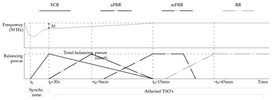 The European Commission Regulation EU 2017/1485 on guidelines for the operation of the electricity transmission system, and the European Commission Regulation (EU) 2017/2195, establishing electricity-balancing guidelines provided for four-level frequency regulation processes or platforms. The platforms are dedicated to frequency containment reserves, automatic and manual frequency restoration reserves (aFRR/mFRR), and replacement reserves (RR). All of them (see Table 1) are introduced into the system in a certain chronology after the occurrence of active power imbalance, as shown in Figure 1.