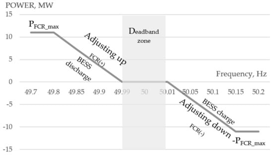 As the frequency deviation increases, the required active power increases linearly. If the frequency deviation is above 50 Hz, there is active power surplus in the network. This means generated active power must be reduced, or negative FCR provision (FCR (−)) is required, and vice versa—when frequency is below 50 Hz generated active power must be increased or positive FCR power (FCR (+)) is required. In the BESS case the positive FCR is provided by discharging the BESS and negative—by charging BESS. In the calculations, BESS power is assumed to be positive if BESS is charged, and negative if BESS is discharged.
