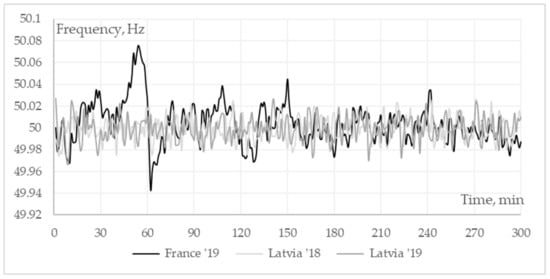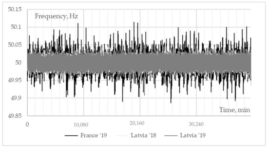 Frequency data provided by the Latvian TSO for 2018 and 2019 were used in the calculations of BESS operation, as well as the calculations with French power system (RTE) data [22] for 2019 were used for comparison. Frequency measurements are summarized at 1-min intervals.