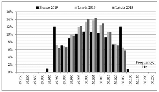 Frequency histogram of Latvian and French power systems.