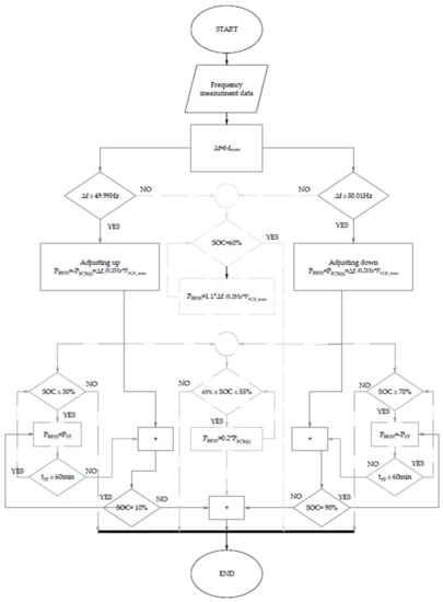 The algorithm (Figure 6) is conditionally divided into two parts—FCR provision and SOC recovery–which in turn is divided into three parts according to the above-described SOC management options: deadband utilization, FCR overfulfillment, and scheduled market transactions.