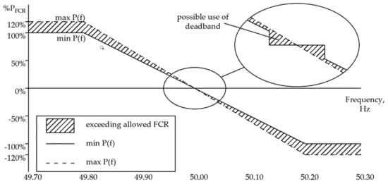 where ±PFCR(t)—actual necessary positive or negative power for FCR provision according to frequency deviation, ∆f = f − fnom—deviation of actual frequency f from the nominal frequency fnom = 50 Hz, PFCR_max—maximal FCR power defined in Table 3, and ∆fmax—maximal frequency deviation at which total prequalified FCR power should be activated. In the synchronous grid of Continental Europe, the maximum steady-state frequency deviation is ±200 mHz, at which full FCR power must be activated in 30 s. The frequency band or deadband in which FCR delivery is not required is ±10 mHz [21,22].