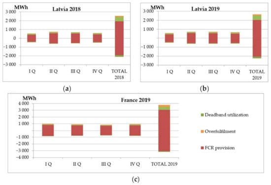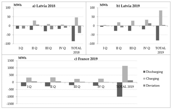 Figure 9 shows the amount of electricity required for the renewal of the SOC through the scheduled market transactions, which allows to estimate the necessary additional costs for BESS charging or income from BESS discharging. Figure 9 shows that the planned market transactions took place differently on a quarterly basis. In 2018, in case of frequency changes of the Latvian power system, the predominance was mainly of sold electricity, creating additional income from BESS discharging. On the contrary, in 2019 the amount of electricity purchased for BESS charging was higher (4 MWh), creating additional operating costs. In the case of larger frequency deviations, as was the case in France, a significantly higher volume of market transactions was observed for SOC renewal (with a capacity of 2 MW). In total, the amount of electricity purchased for the renewal of SOC in France through scheduled market transactions was 142 MWh.