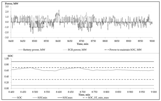 Calculating the Equation (2) and rounding up, the battery nominal capacity of 7 MWh was determined. In addition, the BESS’s normal state of charge (SOCnorm) should be maintained close to 50% to guarantee full BESS availability for both up and down FCR regulation. The calculation assumes that a normal state of charge level is 60%.