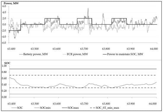 According to the requirements of the European Commission Regulation EU 2017/1485, both upward and downward FCR provision must be ensured for at least 15 min. This criterion sets the limits for the operation of BESS or the state of charge (SOC). The state of charge for the BESS is an important criterion in planning its operation. BESS manufacturers do not recommend fully discharging or recharging the Li-ion battery systems due to increased degradation of the battery cells. Instead, the maximum and minimum charge conditions that must be observed to ensure that the life cycle specified by the BESS are maintained. The developed BESS model assumes that the maximum SOC (SOCmax) is 0.9 or 90% of the nominal capacity (EBESS_nom) of the battery, while the battery can be discharged (SOCmin) up to 10% of its nominal capacity. Thus, the maximum battery depth of discharge is 80%, which determines the actual available capacity of the battery (EBESS_fact).