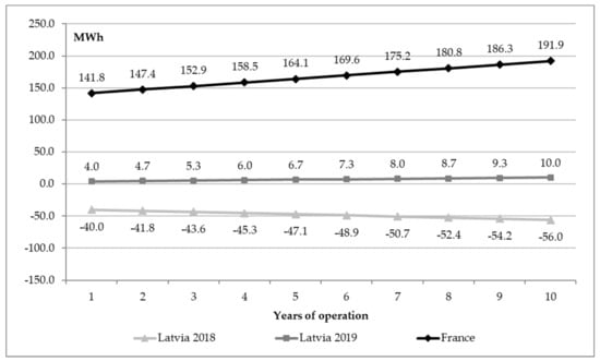 Considering all the above basic economic assumptions, the BESS project does not pay back during its technical life. The calculated NPV in year 10 for the Latvian example is −1.7 MEUR and IRR 0.64%. The BESS project would require at least 25% co-financing to ensure a payback period of 10 years. In the case of the French energy system, for example, there is correspondingly lower return on investment.