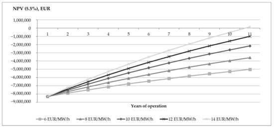 The BESS project will payback during the technical life of the battery (10 years) as long as the price of the FCR service is at least 14 EUR/MW per hour. At this price, the planned BESS revenue will be EUR 1.32 million per year. However, there are currently no clear forecasts for the future development of FCR service prices. There is currently no FCR market in the Baltic power system, so the costs of the region’s FCR service are difficult to predict. For example, with the introduction of daily auctions, the price of the FCR service in the German market decreased from 14.6 EUR/MW/h in 2017 to 8.7 EUR/MW/h in 2019. The price of the FCR service will be determined by the marginal price of the bids offered in the auction.