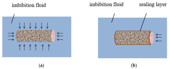 The traditional imbibition experiment immerses the core in the imbibition liquid (Figure 1a) [9,16]. The two end faces and cylinder faces of the core are imbibition faces, and oil discharged from the cylinder area dominates in the experiment. This experimental method has two deficiencies, as follows: first, the experimental results will have great deviations due to the non-uniform core length; second, the imbibition effect and its effective distance is difficult to objectively reflect due to the dominant radial imbibition in the cylinder face. In response to these problems, the traditional multifaceted and multidirectional oil imbibition experiment method is improved to a one-face and one-way approach (Figure 1b). The cylindrical surface and one-end surface of the core is sealed, and only the other one end surface is used as the oil discharge surface to contact the imbibition liquid. Thus, the imbibition area and the oil discharge direction are easy to standardize. Using the method shown in Figure 1b, the deviation and uncertainty of the experimental results of oil discharge caused by the difference in core size, morphology, and multidirectional imbibition among different experiments can be effectively eliminated. When the size of the core in the oil discharge direction is sufficiently large, the contribution of effective imbibition distances of different cores to oil discharge can be truly reflected.