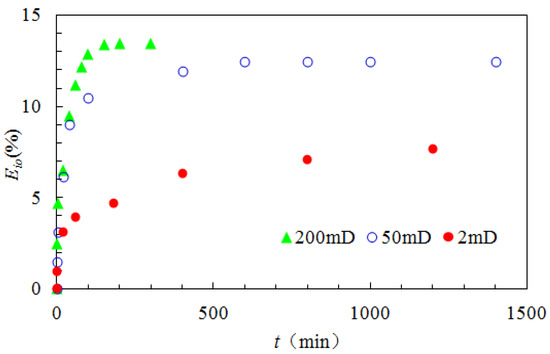 Figure 7 shows the correlation between the imbibition oil limit recovery Eiol of cores with permeabilities of 2, 50, and 200 mD and wettability index WI. Figure 7 shows that the relationship between Eiol and wettability index WI of ultra-low permeability and medium–high permeability cores has the same qualitative characteristics. In the oil-wet range with a wettability index of −1.0–0, whether it is an ultra-low permeability core or a medium–high permeability core, the imbibition oil recovery is 0. When the rock is water-wet, Eiol of cores with permeability from 2 to 200 mD increase fast firstly and then slowly with the increase in WI. These results show that for weak water-wet rock (WI < 0.5), its potential of enhanced oil recovery by imbibition is greater than that of strong water-wet rock.