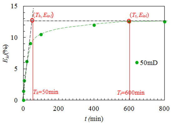 In the initial stage of oil imbibition, the imbibition oil recovery increases quasi-linearly with time. In the Eio-t diagram, the quasi-linearly increasing experimental points are selected to draw a straight line, which intersects with the Eiol = 12.48% line at (Th, Eiol), where Th is the high-speed oil imbibition critical time (50 min) of the experiment.