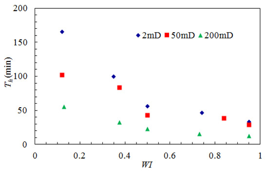 In the experiment of Zhu [4], Th of medium water-wet core is 800 min, corresponding Tt is 3000 min, Th of weak water-wet core is 1200 min, and corresponding Tt is 5000 min. In Zhou’s experiment [15], it could be found that the Tt of cores without crude oil soaking (strong water-wet) was 1000 min, and the Tt of cores soaked in crude oil for 240 h (weak water-wet) was 20,000 min. Compared to these findings, this paper is not limited to the comparison of the imbibition results of two different wettability cores, but concludes related rules between imbibition and wettability. For Figure 4 and Figure 5, in the range of WI from 0 to 0.4, Th decreases sharply with the increase in WI and in the range of WI from 0.4 to 1.0, Th decreases slowly with the increase in WI. This shows that in the weak water-wet range with WI of 0–0.4, the imbibition time increases significantly with the weakening of water-wetness; while in the medium–strong water-wet range with WI of 0.4–1.0, the imbibition time decreases slowly with the increase in WI.