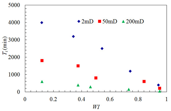 Figure 5 shows the correlation law between the critical time Tt and the wettability index WI of the cores with permeabilities of 2, 50, and 200 mD. Figure 5 shows that the law and main characteristics of Tt changing with wetting index WI are consistent with Th, and the difference is mainly that the influence of wetting index on Tt is more sensitive than that of Th. For example, the critical time for terminal imbibition for ultra-low permeability and weak water-wet cores (WI = 0.12) is 10 times that of strong water-wet cores (WI = 0.95).
