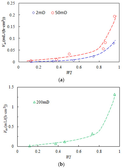 In the production of low permeability tight oil reservoirs, the rate of imbibition is one of the main criteria to determine the matching injection–production rate. As a parameter closely related to the production of low permeability tight oil reservoirs, the average oil imbibition rate Vio is determined in the process of imbibition experiments according to Formula (2), and the relationship between Vio and wettability index WI is obtained (Figure 6).