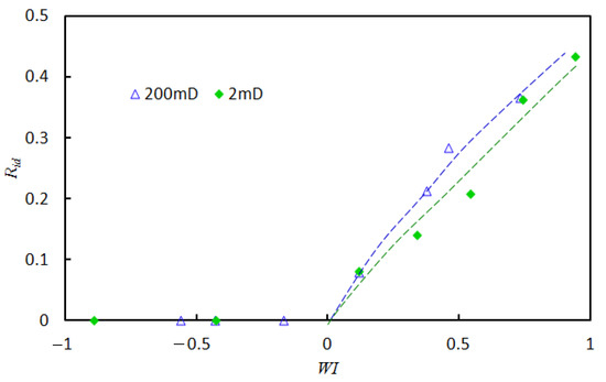 Using artificial cores of uniform size (φ2.5 × 6 cm), water flooding experiments were carried out under the same conditions. The ratio of imbibition oil recovery to water displacement efficiency of the core with the same permeability and wettability index is defined as the imbibition and displacement ratio Rid. Figure 8 shows the experimental law that Rid of medium–high permeability (200 mD) and ultra-low permeability (2 mD) cores monotonically increases with WI increasing. Comparing and analyzing the experimental results in Figure 8, under the experimental conditions of this study, the imbibition and displacement ratios of the two cores are very close. This finding shows that, based on the water-flooding efficiency, the contribution rate of oil imbibition in ultra-low permeability cores to crude oil production in the cores is not lower than that in medium–high permeability cores. In addition, considering that the water-flooding resistance in the ultra-low permeability tight oil layer is extremely large, the pressure difference to drive the matrix crude oil is difficult to establish, and the imbibition effect is more important in its production than in the medium–high permeability oil layer.