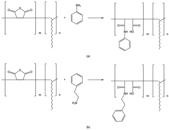 The second step is to obtain comb-type copolymers containing different side chains by grafting the reaction [29]. The reaction equations are shown in Figure 3. The specific operations are as follows. Aniline and α-octadecene maleic anhydride copolymer were put into a three-necked flask at a molar ratio of 1:1, which was dissolved in toluene. The temperature was raised to 75 °C, and the reaction proceeded for 15 h. The product solution was added dropwise to excess methanol, and the final product was obtained by precipitation, washing, filtration, and drying, which was named AMAC. EMAC was synthesized with phenylethylamine and α-octadecene maleic anhydride copolymer in the same way.