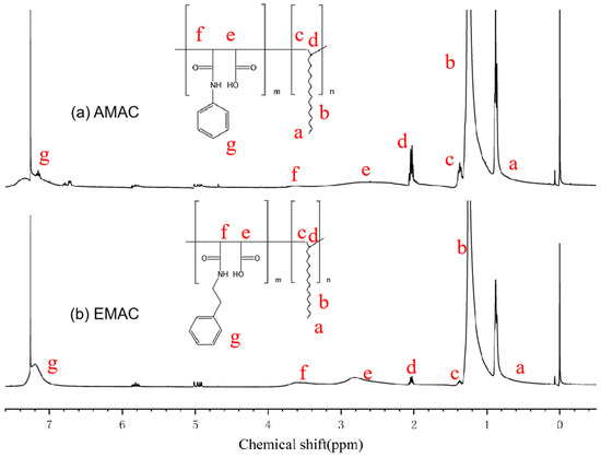 The chemical structure and 1HNMR spectra of AMAC and EMAC are shown in Figure 5. Peaks a, b, c, d, e, and f represent the hydrogen of -CH3- in octadecene, hydrogen of -CH2- in octadecene, hydrogen of -CH2- on the backbone of the octadecene, hydrogen of -CH- in octadecene, hydrogen of -CH- in maleic anhydride, and hydrogen of the benzene ring, respectively. These peaks mean that AMAC and EMAC were successfully synthesized. In AMAC, the ratio of hydrogen of -CH3- in octadecene and hydrogen of the benzene ring is 0.59, and in EMAC, the ratio of -CH3- in octadecene and hydrogen of the benzene ring is 0.72, which are calculated from the ratio of the peak areas of a and f obtained by integration of the peaks on the 1HNMR spectra.
