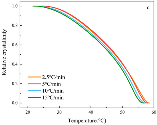 The relationship between the relative crystallinity and temperature of the three samples at different cooling rates was plotted in Figure 8. For all three samples, the crystallization rate was much greater in the early stage of crystallization. As the relative crystallinity was raised from 0.8 to 1.0, the crystals collided with and squeezed each other due to the increase of crystallinity, the crystallization rate decreased, and the curve tended to be flat. In addition, to achieve the same relative crystallinity at the same cooling rate, it takes a wider temperature range for the sample without comb-type copolymer additives.