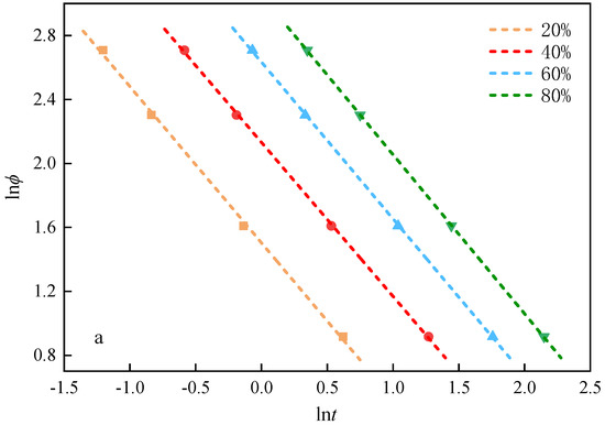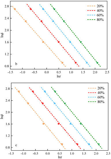 Figure 9. The lnϕ as a function of lnt: (a) VGO4, (b) VGO4 + 100 ppm AMAC, and (c) VGO4 + 100 ppm EMAC.