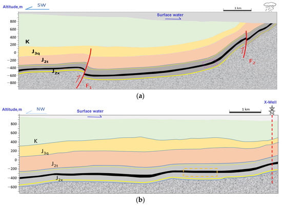 The hydrogeological profile of the Tiaohu Sag. (a) Along the northeast-southwest direction. (b) Along the northwest-southeast direction.
