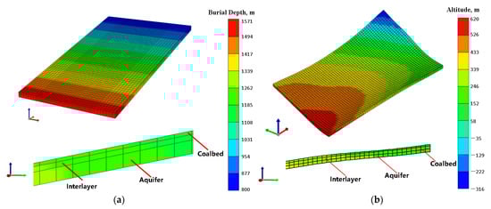 According to hydrogeological study, the coal seam roof has enough safety thickness, with little impact on gasification, so only the influence of the coal seam floor shall be considered. Table 1 shows the basic parameters of the geological model. Figure 3a,b show an ideal conceptual model and an actual geological model of the pilot area, respectively.