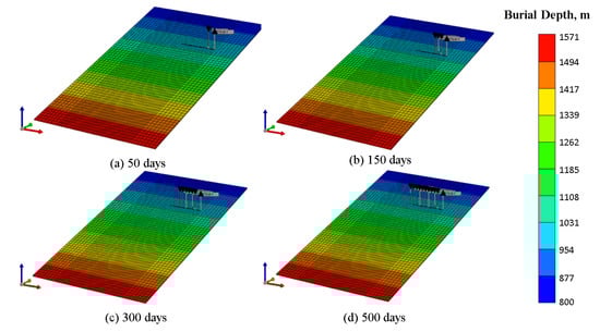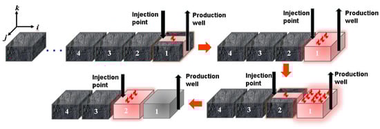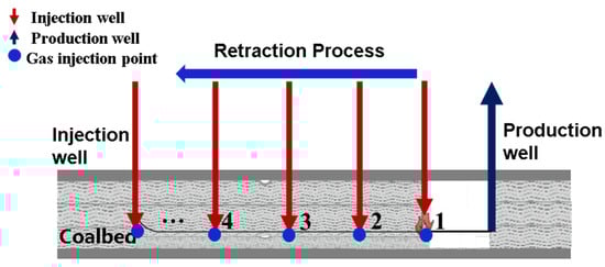The gasification process of the CRIP is simulated according to the established geological model. In this study, the retraction dynamic process is realized by moving the injection well position, as shown in Figure 4. The receding speed of the gas injection point is 50 m/50 days.