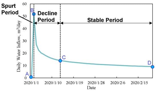 Coal seam water pouring into the gasifier is generally a three-stage process, including a spurt stage, a decline period, and a stable period. Figure 6 shows the change in water inflow when a certain gasifier is instantly burned to a predetermined size. Section A–B is the first stage, and the coal seam water inflow into the gasifier increases sharply until it reaches the maximum value B. Point B becomes the maximum instantaneous inflow. In the second stage B–C, the coal seam water inflow into the gasifier begins to decrease. After point C, the water inflow into the gasifier changes little and becomes stable. Point D becomes the steady water inflow. The maximum instantaneous water inflow, the value of point B, ought to be focused on, and the data starting from point B should be recorded in subsequent studies.