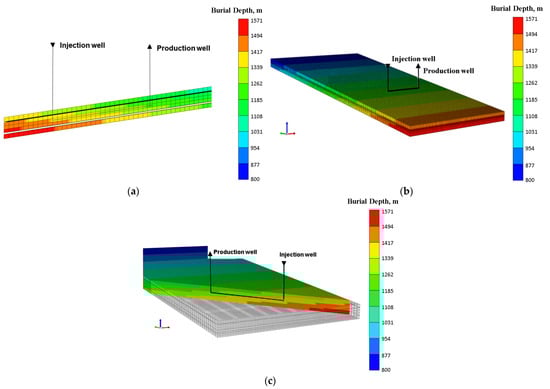 The CRIP unit adopts a U-shaped structure, which consists of a production well and a horizontal injection well. The combustion diffusion, combustion time and water inflow are different with position alteration of the injection well and the production well because of the dip angle [26]. In order to explore the influence of different gasifier types on gasification, three different well patterns are designed in this project. Figure 7a,b show the well pattern of horizontal wells along the dip of the coal seam and along the strike of the coal seam, respectively. In Figure 7c, the horizontal well extends along a 45° dip with the coal seam inclination.